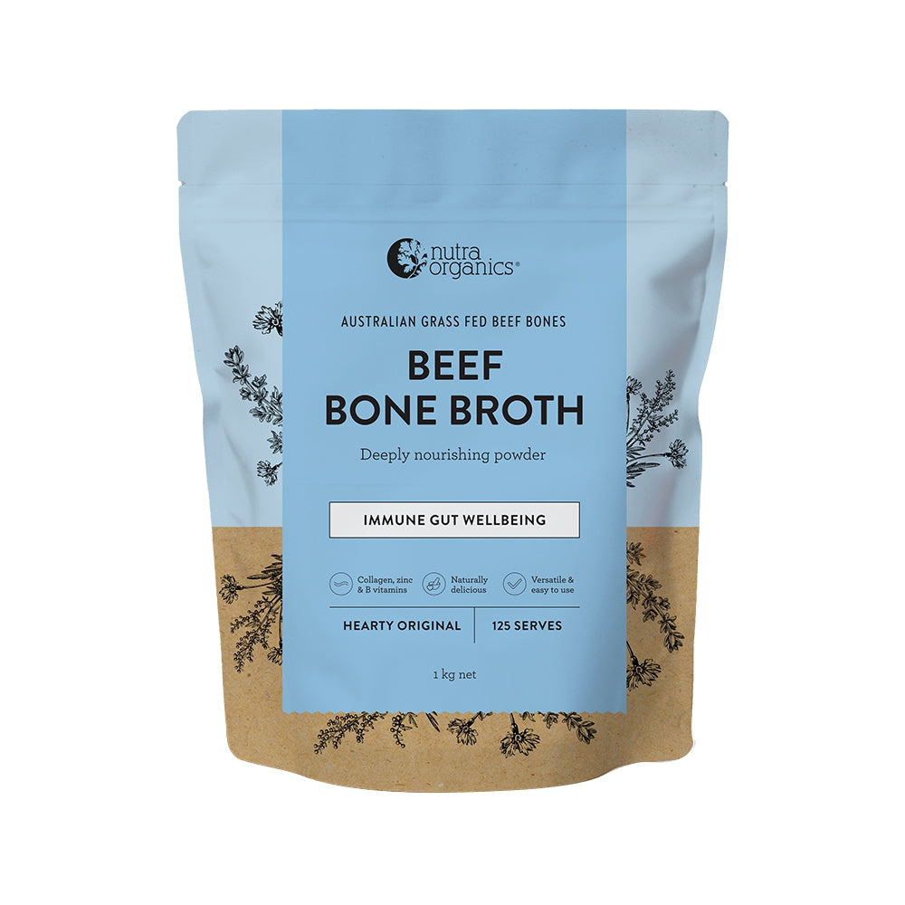 Nutra Organics Beef Bone Broth Hearty Original is naturally nourishing with a source of protein and collagen, Zinc, and B vitamins.